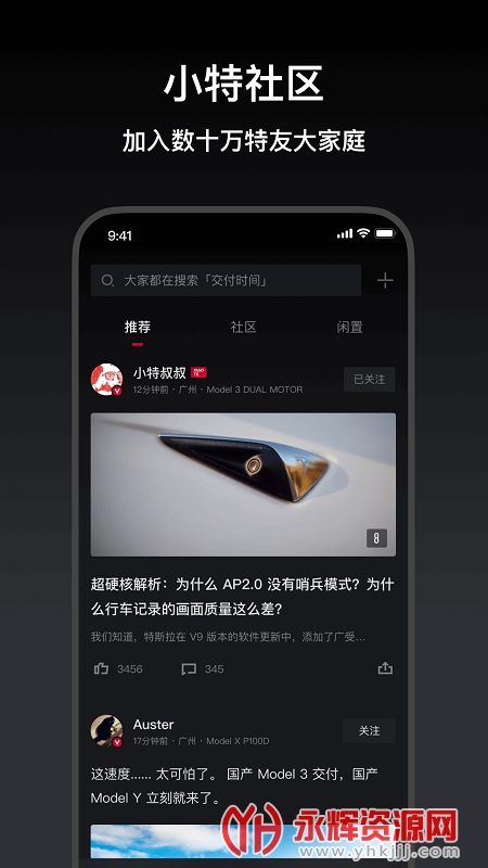 小特社区app是为广大车主朋友们提供的服务软件,在软件中你可以查看特斯拉品牌的最新资讯内容,还可以查看自己爱车的电量以及基本情况,有需要的朋友们快来永辉资源网下载使用哦!