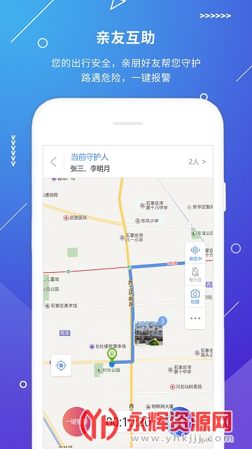 每一个用户账号可以绑定若干亲友“守护人”。当用户开启“亲友互助”功能后,亲友“守护人”接到提醒,可查看用户的轨迹以及上传的音视频、文字、图片等,进行实时守护。发现可能存在危险时,一键报警求助。这项功能可降低在危险环境受侵害的可能性。