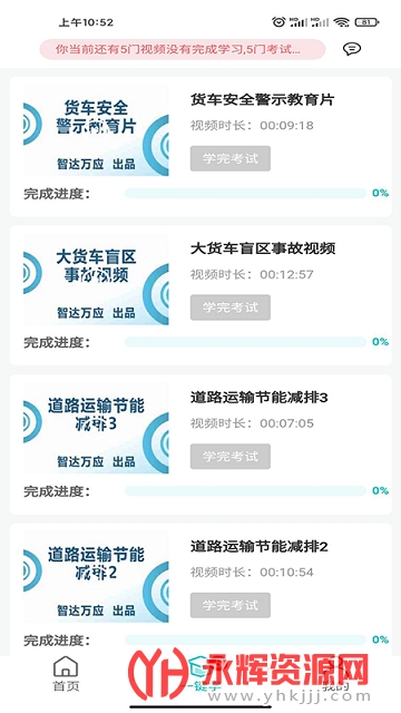 学习资源包括公共视频和课程视频。公共视频为基础道路知识和交通趣闻视频,课程视频为专业的道路运输讲解。