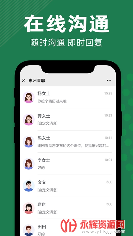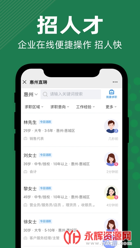 惠州直聘app是一款十分好用的线上找工作平台,软件中汇集了超多优质的工作岗位,你可以根据自己的能力找到一份适合自己的工作,有需要的朋友们快来永辉资源网下载吧!