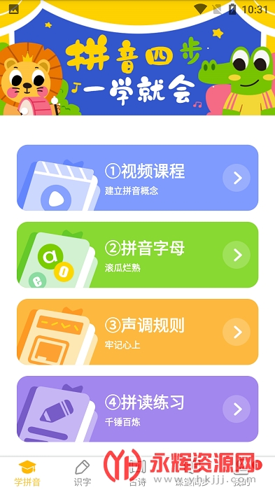 爱学拼音app是一款专为儿童们打造的拼音学习软件,软件上有着丰富的专业的视频课程,每一个知识点的讲解都十分详细,可以帮助用户们轻松的学习拼音,快速的掌握拼音技巧!欢迎感兴趣的朋友们前来永辉资源网下载!