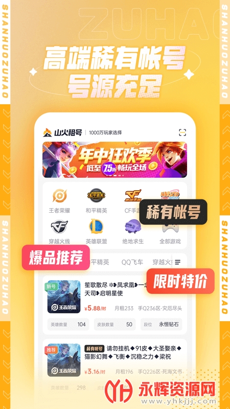 山火租号app让用户在线租号的手机软件,在这里提供了非常多不错的游戏账号,这些游戏账号内容很全,用户可以更好的享受不同游戏账号带来的特色,而且还可以享受最全游戏账号的魅力,让你在线选购各种心仪的账号更加的简单,享受最优质的选择账号带来的便捷哟,其服务也更加的全面。