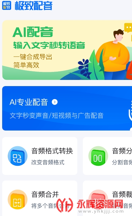 极致配音app是一款非常好用的配音变声软件,这款软件上提供了丰富的配音素材效果,包含了各种语言类型、各种风格的配音效果,可以满足用户们的各种需求,并且还支持音频裁剪、音频合成和音频格式转换等等,可以帮助用户们轻松的进行各种配音!欢迎感兴趣的朋友们前来永辉资源网下载!