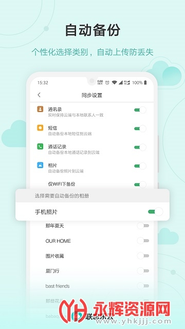 一键设置:自动进行照片、通讯录、通话记录、短信备份,再也不用担心忘记备份了!