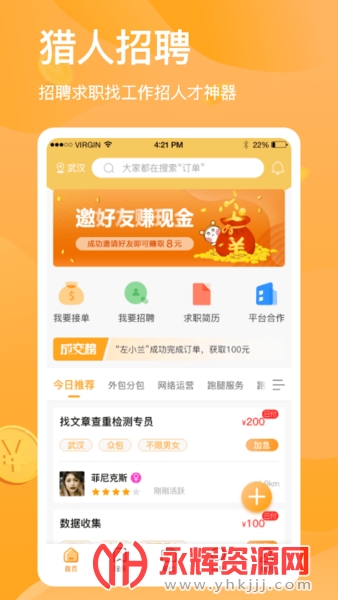 猎人招聘app是一款十分好用的线上找工作平台,软件中的工作岗位十分齐全,在这里你能放心的找到适合自己的好工作,还在等什么呢?快来永辉资源网下载吧!