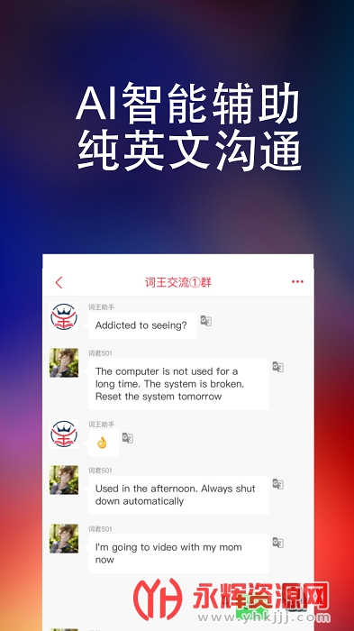 纯英文实时互动聊天,AI智能辅助翻译,让你爱不释手的英语学习助手,英语考试必备助你轻松背单词!