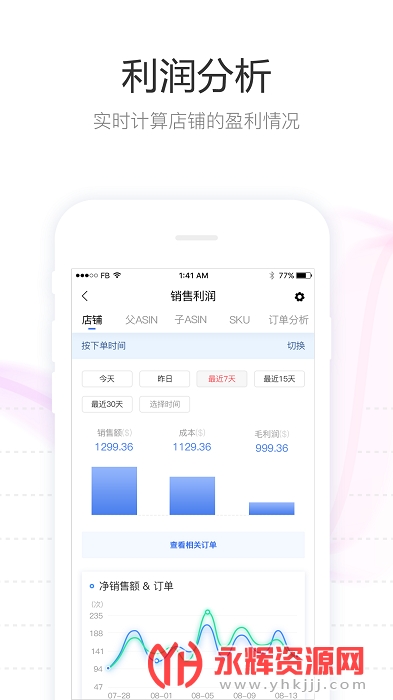 f) 销售利润分析:可根据ASIN或SKU筛选展示商品销售额、成本和利润等数据;