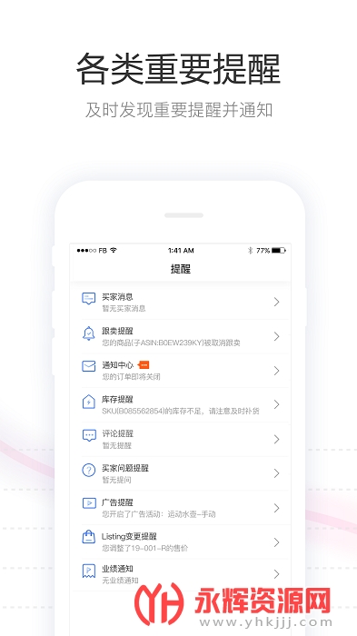 提供新买家消息提醒、业绩通知提醒、A-to-Z投诉提醒、库存提醒、被跟卖提醒等各类重要通知。