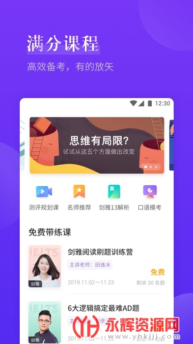 雅思考满分app是一款专业的英语学习软件,专为雅思备考学习打造,软件上有着海量的学习内容,覆盖了雅思听力、雅思阅读和雅思写作等等,为广大考生们提供了全面详细的学习资源,帮助大家更好的学习,助力雅思考满分!欢迎感兴趣的朋友们前来永辉资源网下载!