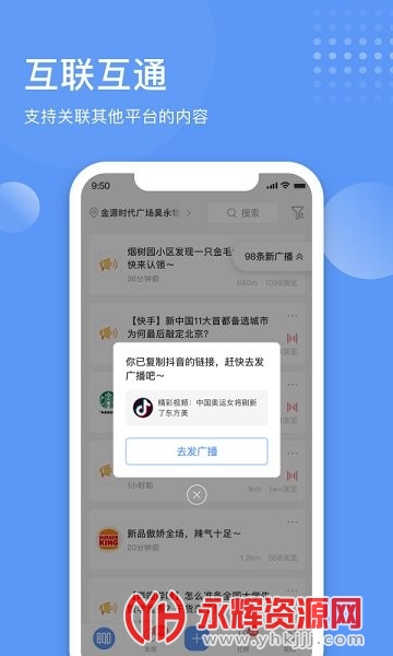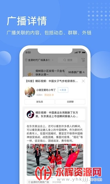 广播关联的内容,包括动态、群聊、外链、多种信息类型随你喜欢