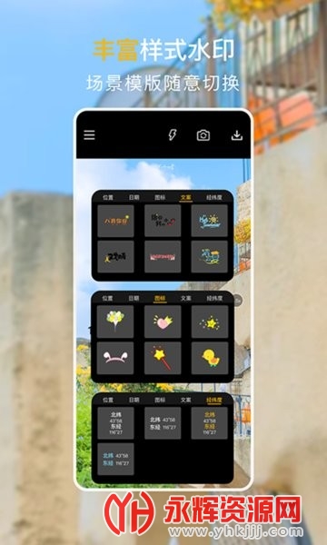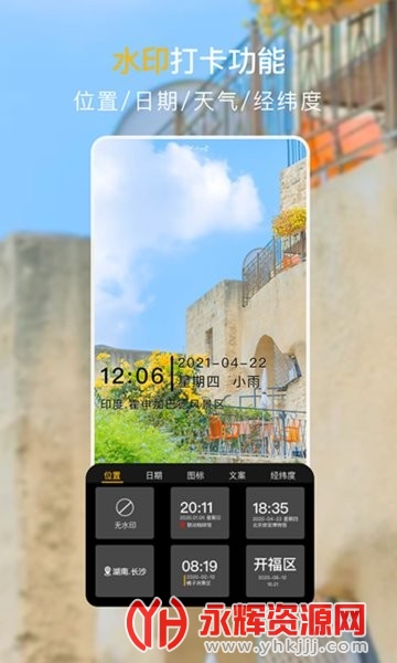 经纬度定位相机app是一款非常优质的手机定位拍照软件,使用这款软件进行拍照就可以显示定位信息和时间、天气等等,有需要的朋友们快来永辉资源网下载使用吧!