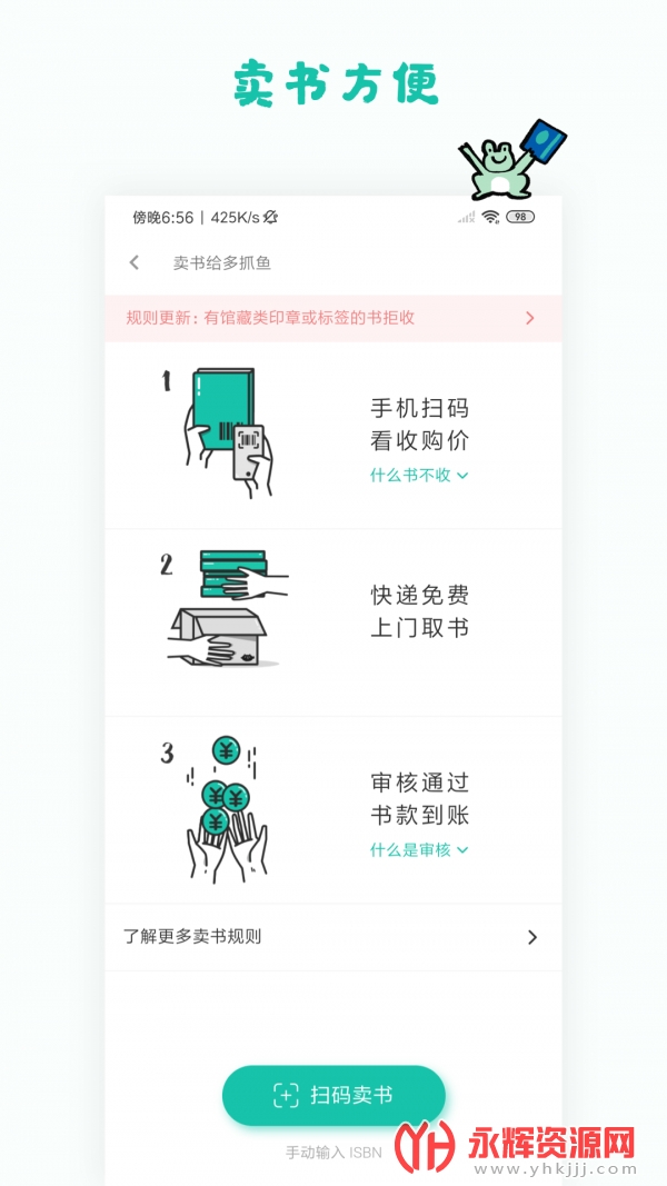 有闲置书籍要处理?在多抓鱼 app 内直接扫描图书 isbn 码,即时查看书籍收购价。下单后免费上门取书,多抓鱼收到书并审核通过后,即刻打款,方便无负担。