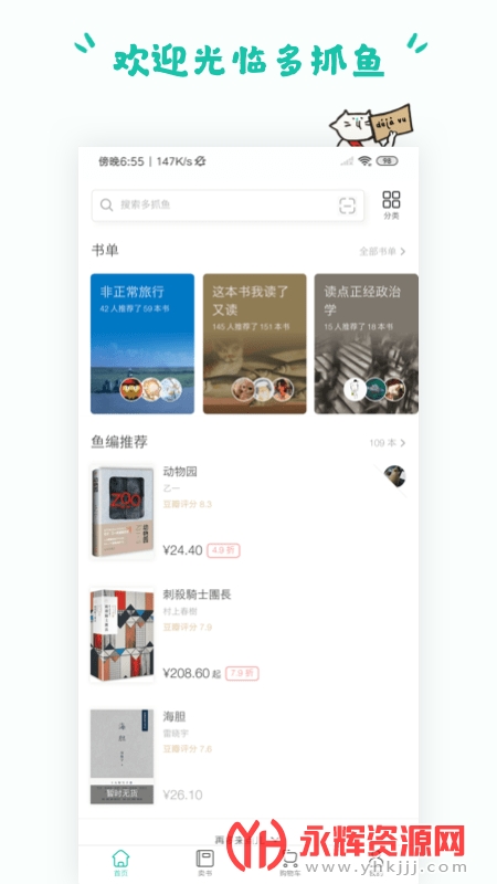 超过 100 个不同主题的特色书单,每个人都可以参与,推荐自己中意的书籍。随时随地在书单淘书,发现视野以外有趣的书,与兴趣相投、品位独到的鱼友相遇,懂书的人不孤独。
