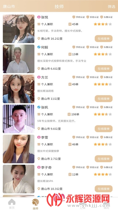 开启定位就能自动为用户搜索附近的技师,查看技师的基本信息后可以下单预约