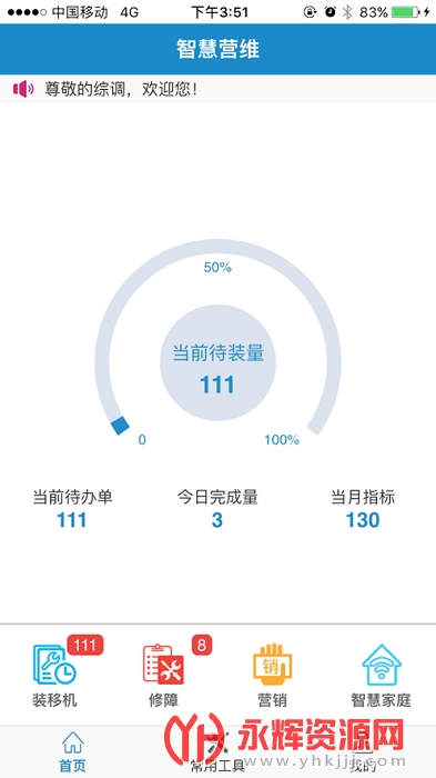 电信营地移动运维中心是电信维护人员使用的移动运维中心,可以看到日常工作任务、安装了多少台机器以及要处理多少障碍