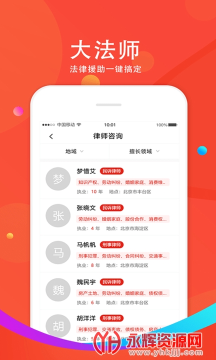 用户可选择领域非常全面,有婚姻家庭、房产纠纷、交通事故、遗产纠纷、合同保障、创业咨询、消费维权、劳动纠纷、债权债务等,用户都可以在相关领域迅速找到专业律师,直接咨询专业律师,解决法律问题。