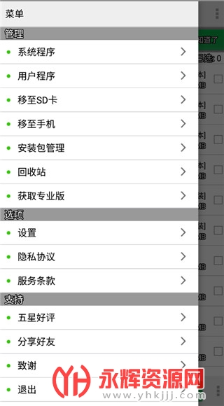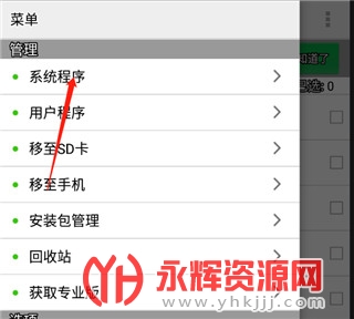 1、打开在本站下载的系统程序安全卸载器,进入首页点击左上角的菜单管理,我们可以看到有很多的功能,如系统程序、用户程序、回收站、设置、安装包管理等等功能