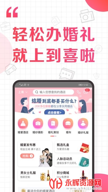 到喜啦婚宴app是一款超级好用的婚礼策划软件,这款软件转为即将结婚的准夫妻们打造,使用这款软件可以为您精心策划出婚礼,有需要的朋友们欢迎来永辉资源网下载使用哦!