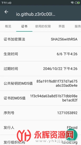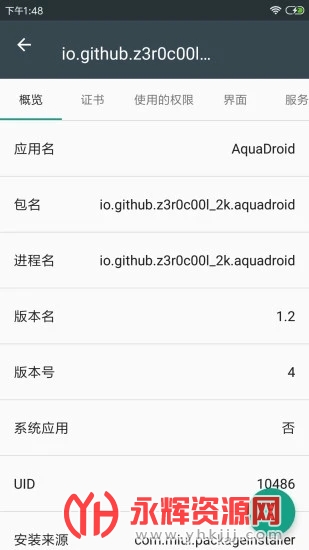 2.支持以下信息查看:apk信息、app信息、应用包名查看、安装日期、升级日期、占用空间、版本号、安装位置、程序界面数量统计、前台后台服务、广播服务、应用权限查看、应用权限管理、拒绝的权限、硬件要求查询、资源文件搜索、证书签名的md5、进程名、UID、安装来源分析、序列号、证书发行人,发行机构,发行国家。还可以指定启动某一个应用的某个界面或查看manifest文件。是一款普通用户或安卓开发人员手机里面必备的开发调试工具软件。