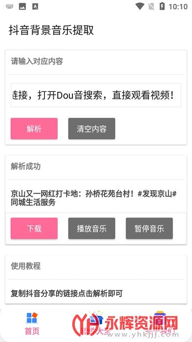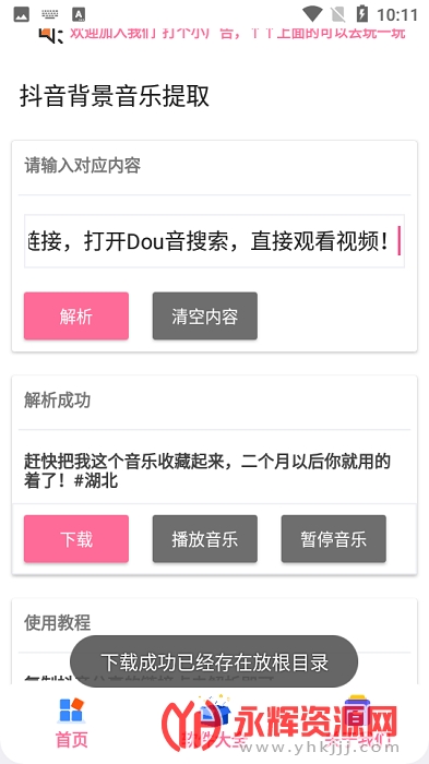 抖音背景音乐解析是一款专为抖音打造的背景音乐解析工具软件,大家在刷抖音的时候是否会发现很多好听的背景音乐呢?但是却不知道这首歌的名字!这时候就可以使用这款软件,将视频链接复制过来,就可以一键识别并下载了!非常的方便好用!欢迎感兴趣的朋友们前来永辉资源网下载!