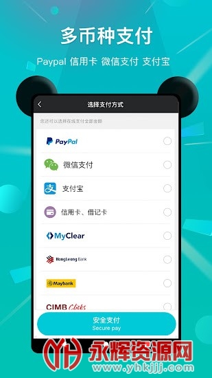 多种支付方式,信用卡、微信支付与支付宝支付、Paypal等支付方式都支持;