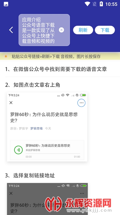 公众号语音下载app是一款非常好用的公众号语音视频下载器,这款软件的操作十分简单,只需复制公众号文章连接,进入应用播放音视频,就能够点击下载音视频资源!欢迎感兴趣的朋友们前来永辉资源网下载!