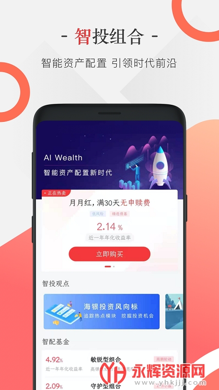 海银基金app是一款十分优质的金融理财服务软件,在这款软件中你可以查看各种基金的实时行情,还可以学习到许多基金方面的小知识,快来永辉资源网下载吧!