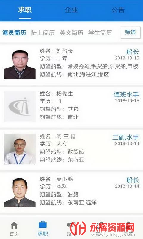 增加了船员英文简历,使得意愿国际航线的船员有更加充分展示自己能力的空间和途径,增加了学生简历,使得海事院校学生可以在毕业之前得以面对全国各大航运企业展示自己的形象和能力,也可以让各大航运企业提前了解船员,为每年的院校双选会有个充分的准备和参考。