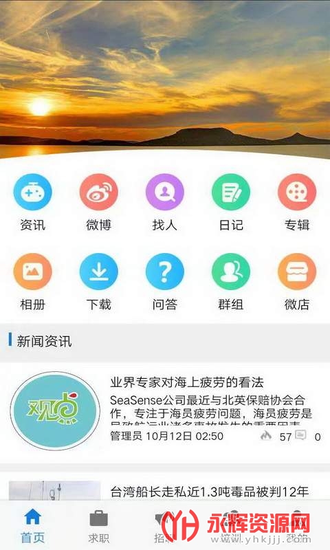 主要功能目前开放求职(海上简历、陆上简历和英文简历,学生简历暂未开放)、招聘(企业招聘通过APP发布招聘等功能暂未开放)、培训(仅供查看,暂未开放发布功能)、资讯、微博、找人、日记、专辑、相册、下载、问答、群组、微店、个人中心等共14个功能。其他功能等待后续开发