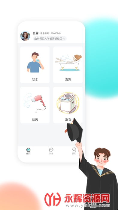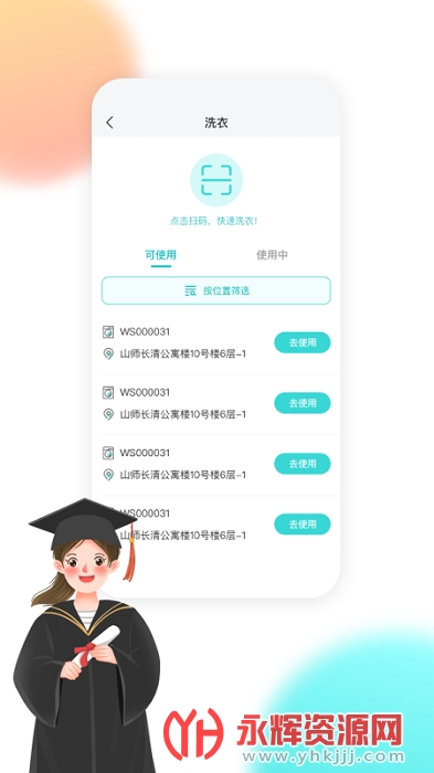 校园汇生活扫码、位置筛选更便捷的使用校园饮水机、洗衣机、洗浴、吹风等生活服务。。