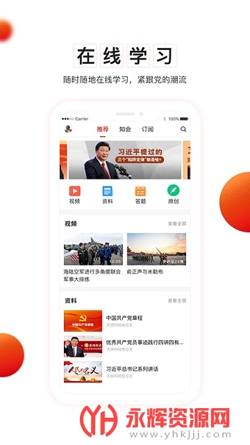 新闻聚焦、红星视频、专题热点、先进典型、党史博览、调查投票、学习统计等固定栏目和干部工作、自身建设、调查研究、走进益阳、农村商务、中共手机报、党建工作等可选学习栏目。