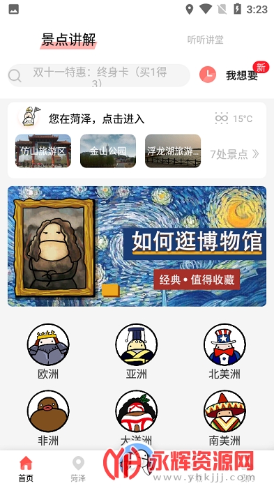 美景听听全球景点讲解电子语音导游app是一款非常好用的旅游导航讲解软件,这款软件收录了全球各大名胜古迹和景区信息,并且还有着专业的语音导游讲解,帮助用户们更好的感受各个景点的魅力,了解各地的风土人情,欢迎感兴趣的朋友们前来永辉资源网下载!