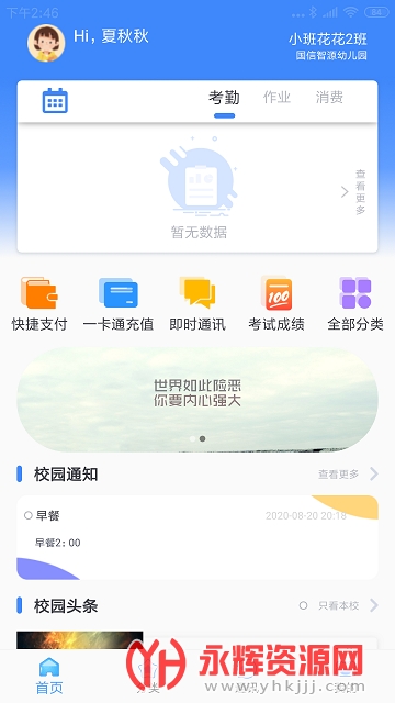集班级作业、校园通告、消费记录、乘车记录、家长之友、平安校园等功能于一体