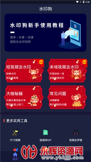水印狗终身vip会员版是一款超多人喜欢的视频去水印编辑工具,这款软件能为你保存的短视频去除水印、本地视频去水印等等,还有超多视频编辑裁剪功能也可以免费使用。有需要的朋友们不妨来永辉资源网下载哦!