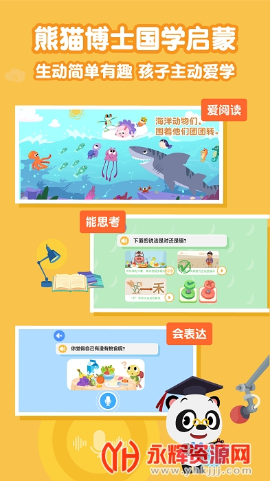 熊猫博士国学是一款专为广大儿童打造的语文启蒙课程学习软件,软件上有着丰富的语文学习知识,涵盖了古诗、绘本、成语等等,采用了非常有趣的动画教学模式,能够更好的激发孩子们的学习兴趣,让孩子们能够跟好的进行学习语文,掌握更多的知识内容,提高语文学习成绩!欢迎有需要的朋友们前来永辉资源网下载!