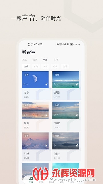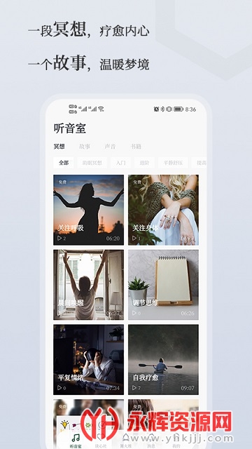 听音板块升级——冥想、故事、声音、书籍解读等多元原创音频,睡眠、专注等不同声音模式,满足你不同场景下的自我疗愈需求。