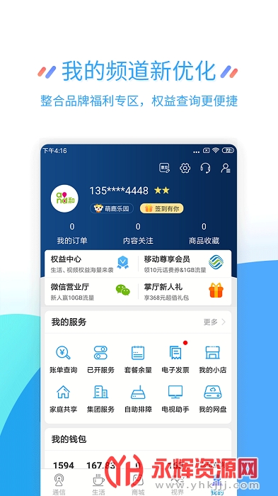 业务办理:4G套餐、上网套餐、语音套餐、短信套餐、手机流量套餐等产品的在线办理、变更及退订。