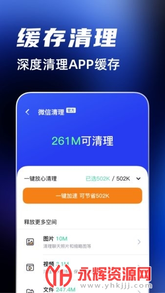 极速清除缓存垃圾,手机即刻变流畅,清理垃圾文件、图片、表情包、语音、视频等,软件使用更流畅。
