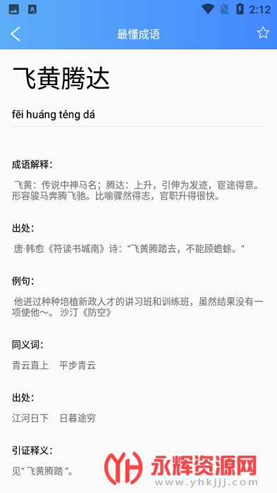 进入成语的详情页面,就能了解解释、出处、例句、同义词等信息。