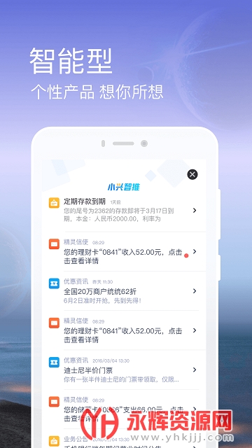 智能推荐,智能推荐兴业好产品及丰富活动,智能菜单、智能功能模块、智能卡包、智能信息推送服务。