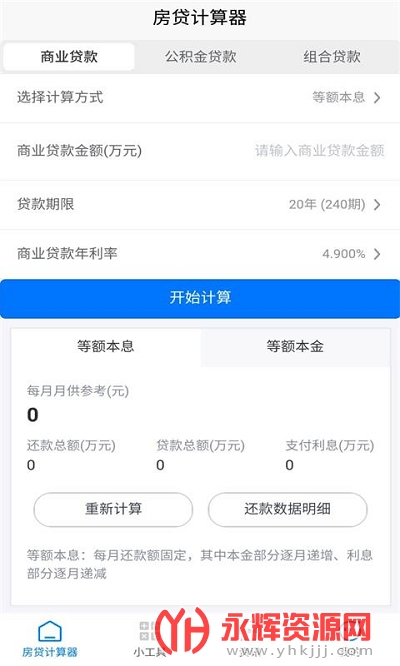 1.功能丰富的助手app,包含房贷计算器,房贷计算包含商业贷款、公积金贷款、组合贷;