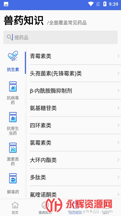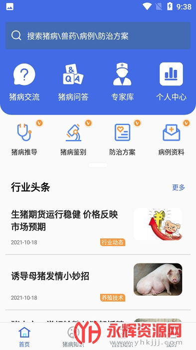 打开主界面,可免费查询和学习全部猪病库和兽药库,可免费查阅最新行业头条,可进行猪病相关沟通交流。