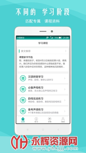 包涵声母、韵母、声调、方言纠正等学习以及测试,具备实时语音评测技术,根据发音到拼音的声母、韵母、声调,找出发音薄弱点,针对性推荐学习课程,减少没必要的学习时间,提高80%学习普通话效率!