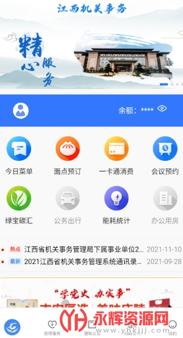 江西机关事务app是江西省机关事务管理局官方推出,软件拥有今日菜单,面点预订,一卡通消费,会议预约,公务出行等等功能服务,需要的朋友欢迎前来下载使用,拥有人员进出登记、车辆进出登记、幼教报名、线上督查等诸多实用功能,方便进行管理,有效提高工作效率,推动工作有条不紊进行。