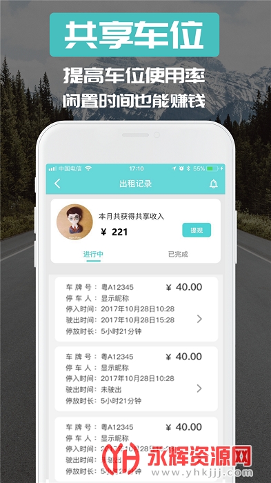 共享车位:家有车位,闲置时间赚钱,一键设置共享时间,白天共享,晚上赚收益。