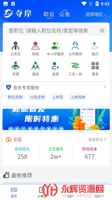 夺岸公考是一款专业的公务员事业单位招考信息资讯软件,软件上有着丰富的公考招录信息,覆盖了全国各地!为每一位用户们提供了实时的报名考试资讯信息,大家可以随时在线查看,了解最新的考试资讯,还能够一键在线报名,获取更加详细的考试信息!欢迎有需要的朋友们前来永辉资源网下载!