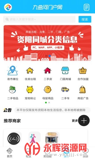 九曲河门户网手机版是一款本地生活服务软件,主要是为资阳的朋友提供了相关的服务内容,用户朋友可以在上面了解到本地的新闻资讯内容,提供了各种吃喝玩乐信息,都是可以根据自己感兴趣的信息内容来了解的,也是提供了便捷的生活服务办理功能,让市民朋友都可以享受到极大的生活便利,欢迎有需要的朋友在永辉资源网下载使用吧!