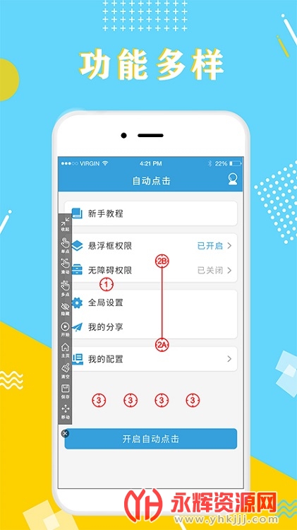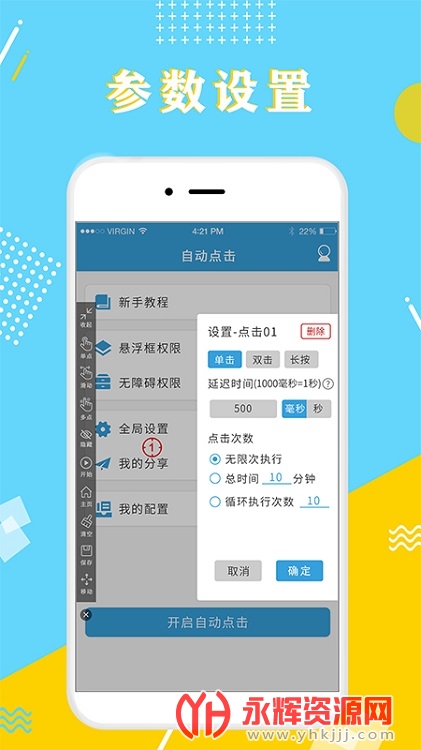 自动点击器极速版给广大的小伙伴提供带来的自动点击应用工具,让你真正的去解放双手,自由设置点击位置、点击速度和点击次数以及轻松设置点击频率、时间间隔等,有需求赶快前来永辉资源网下载体验吧!