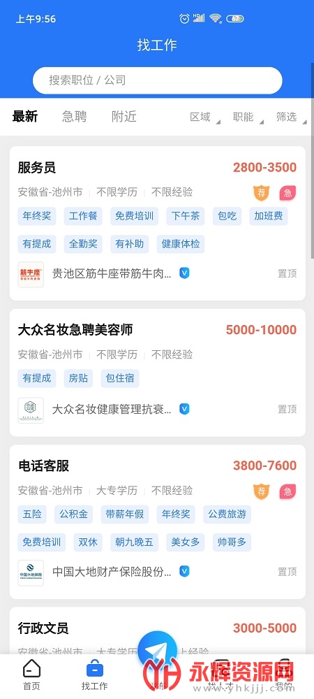 池州招聘网2021最新版是为广大朋友们提供的求职招聘软件,软件中的优质工作岗位十分全面,你可以通过软件找到适合自己的工作,快来永辉资源网下载吧!