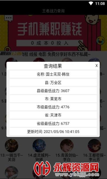 让您随时都能查询当前最新的分数排名,手机端王者荣耀战斗力查询软件,查询全国最低战力地区